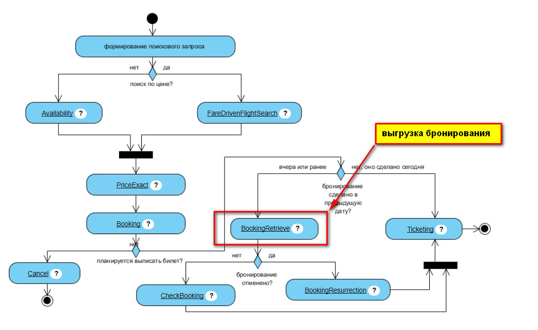 Сервис Booking Retrive (Выгрузка текущего забронированного варианта на доступность выписки) - выгрузка бронирования производится в том случае, если процедура бронирования была сделана за день или ранее инициации выписки бланка авиабилета. В случае, если бронирование подтверждено, следующий шаг проверки и выгрузки маски с актуальной стоимостью CheckBooking. В случае, если бронь была аннулирована по таймлимит или же аннуляция была по инициативе перевозчика, переходим на шаг восстановления бронирования BookingResurrection, пытаемся пересоздать бронирование.
